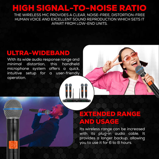 5 Core Wireless Microphone System 4 Channel UHF 492F Range Portable Receiver W Cordless Mic